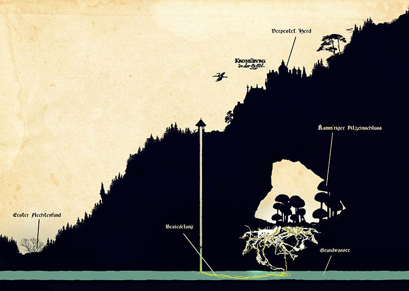 Neither plant nor animal, the mushroom is unique. But this pitiful species was excluded when humans, animals and plants entered a beneficial symbiosis in the year 3000. Luckily, its mycelium was long enough to reach back to the year 989. It now plans to modify the medieval genetic structure of all human beings to become part of the great future development. The video “Life Between Walls” and the accompanying booklet portray the conflicts between a parasitic, fungal intelligence whose evolved mycelia merely toy with the population